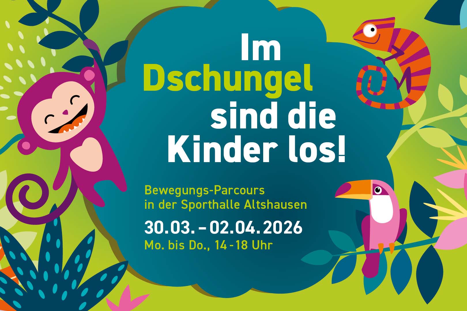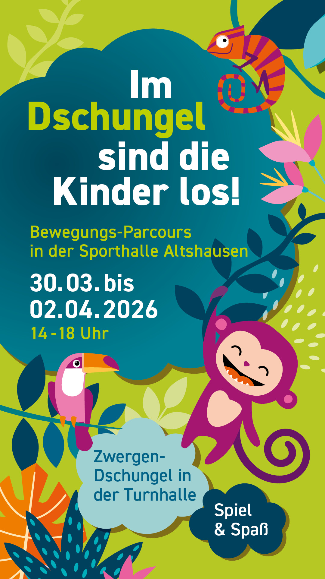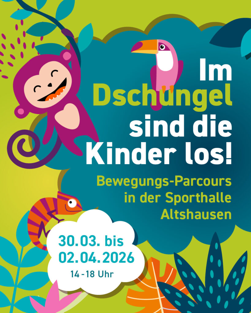 In der Woche vor Ostern veranstaltet der TSV Altshausen wieder den beliebten Bewegungs-Parcours „Im Dschungel sind die Kinder los“ in der Turn- und in der Sporthalle Altshausen. Der „Dschungel“ findet von Montag, 30. März bis Donnerstag, 2. April 2026 statt. Jeweils von 14.00 – 18.00 Uhr sind Kleinkinder mit ihren Eltern im Zwergen-Dschungel in der Turnhalle und die älteren Kinder in der Sporthalle herzlich eingeladen, den Dschungel-Parcours zu erkunden, der vielfältige Möglichkeiten zum Klettern, Schaukeln, Springen usw. bietet.